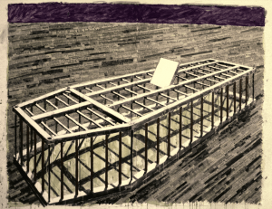 I built a life size coffin to do the drawings. later it was gilded with gold to use in “the E & O Line an Electronic Blues Opera produced by Bill Warrell and District Curators