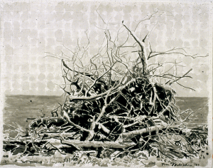 One of many treepiles. I began doing these when I moved from DC (near Chinatown) to Berryville about 3/4 hrs outside of Washington. At that time our little town was too far away to serve as a commuter village because of the distance. They had begun developing The Dulles toll road area with software industry which now put Berryville within a reasonable commuter distance. The result was that a rural orchard community was turning into a housing area for Northern Virginia commuters. They began pulling up the apple trees using large bulldozers and chains. At the height of it all you could see these tree piles in military rank and file extending all the way out to the horizon. At some point they would light them on fire. Each pile of trees was about 20 feet in diameter and 10 to 12 feet high.