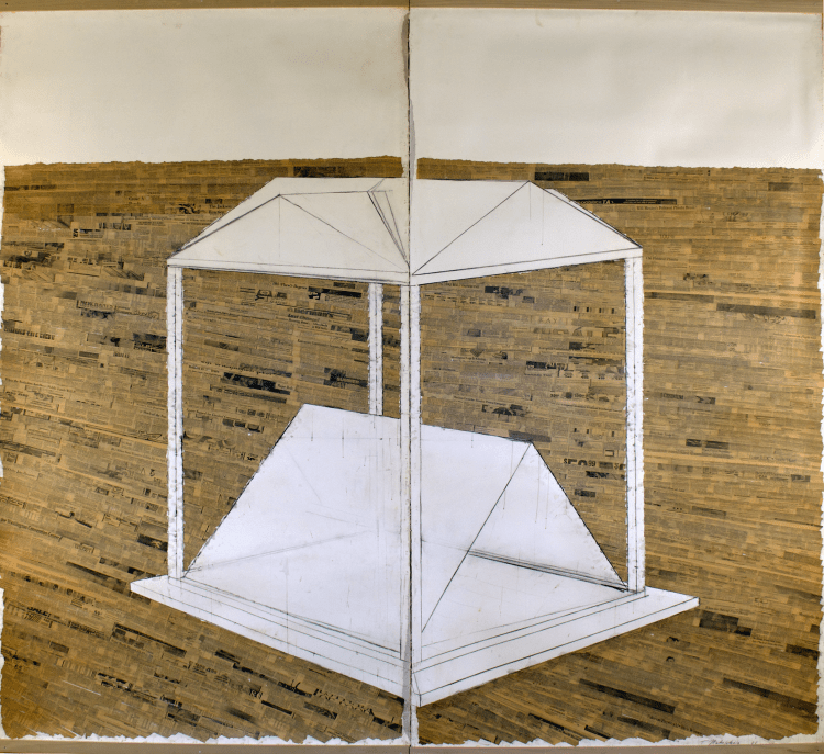 Read MoreCharcoal and newspaper collage on paper, 100″ x 103″. Collection of the artist.