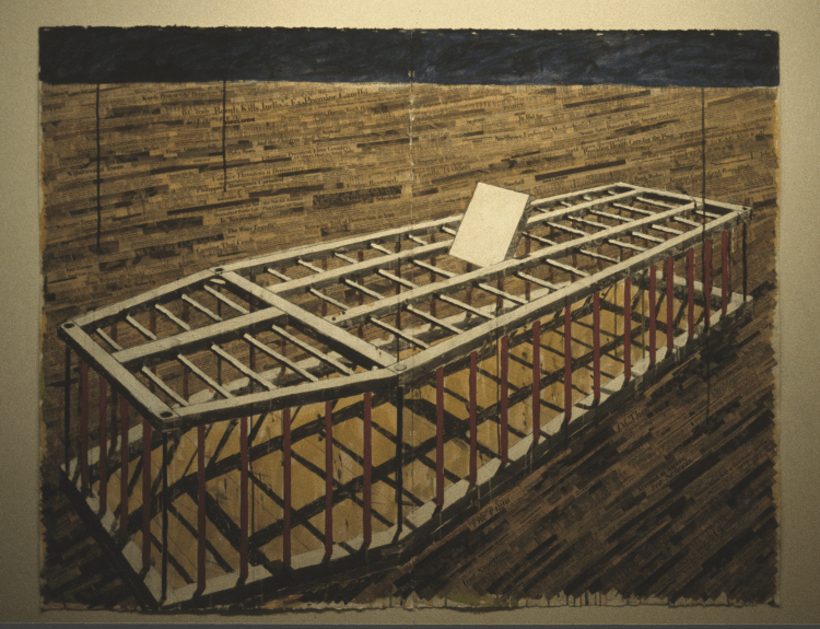 Read MoreMixed media with acrylic and newspaper on paper, 48”x 60”. Collection of Eric Colbert. Wash., DC. I built a life size coffin to do the drawings. later it was gilded with gold to use in “the E & O Line an Electronic Blues Opera produced by Bill Warrell and District Curators