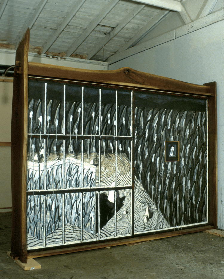 Oil on fusuma (sliding screen), 108” x 123”. Fusuma structure designed and crafted by Mira Nakashima of George Nakashima Woodworkers collection of the artist.